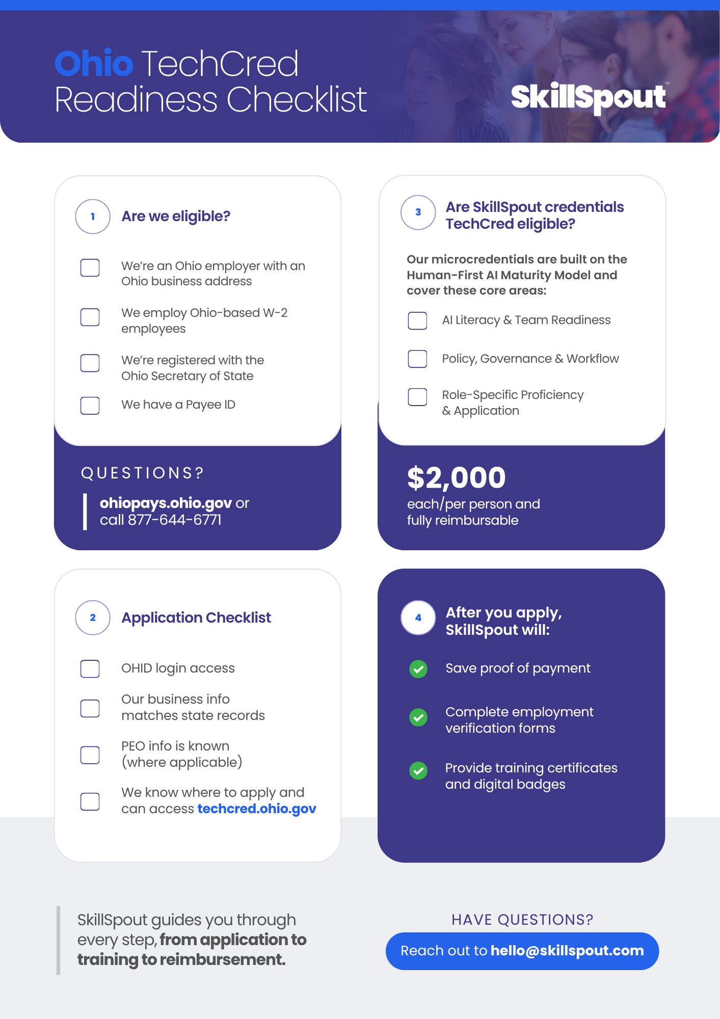 Readiness checklist to verify eligibility and secure Ohio TechCred reimbursement for AI microcredentials.